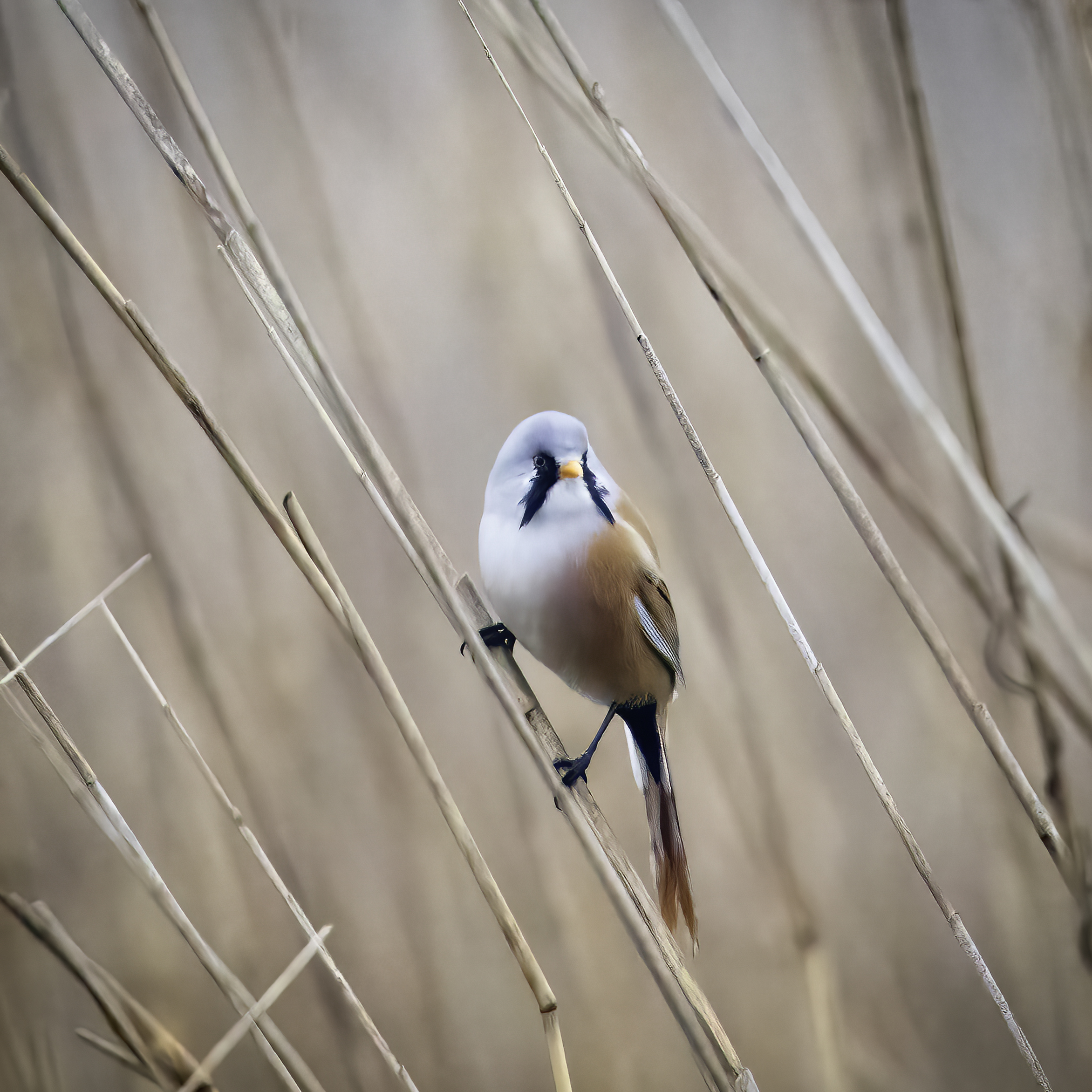 Rietvogel waarvan het mannetje beschikt over de kenmerkende 'bakkebaarden'.