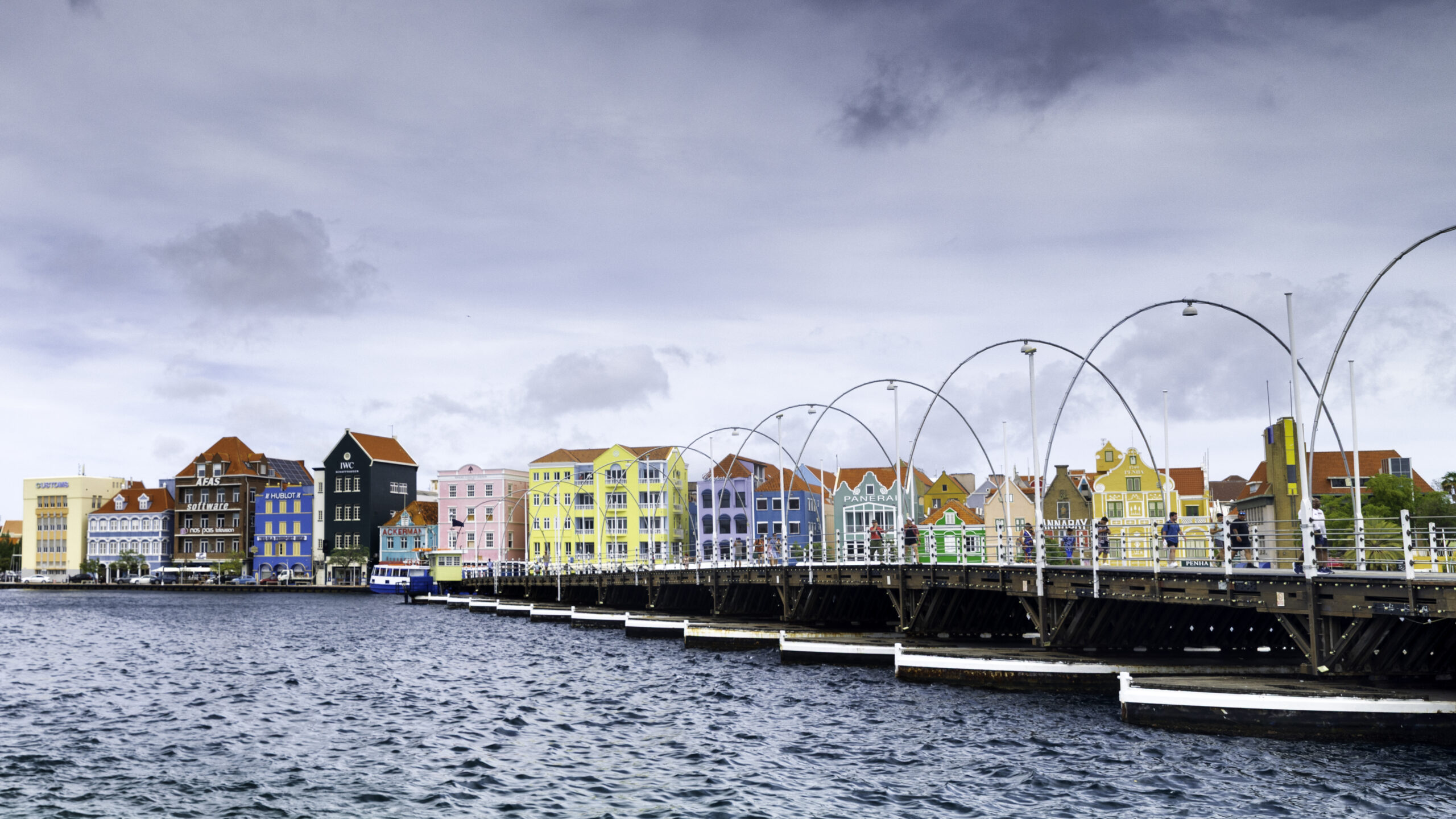 De gekleurde aanblik van de handelskade in Punda terwijl de pontjesbrug (off. Koningin Emmabrug) opent.